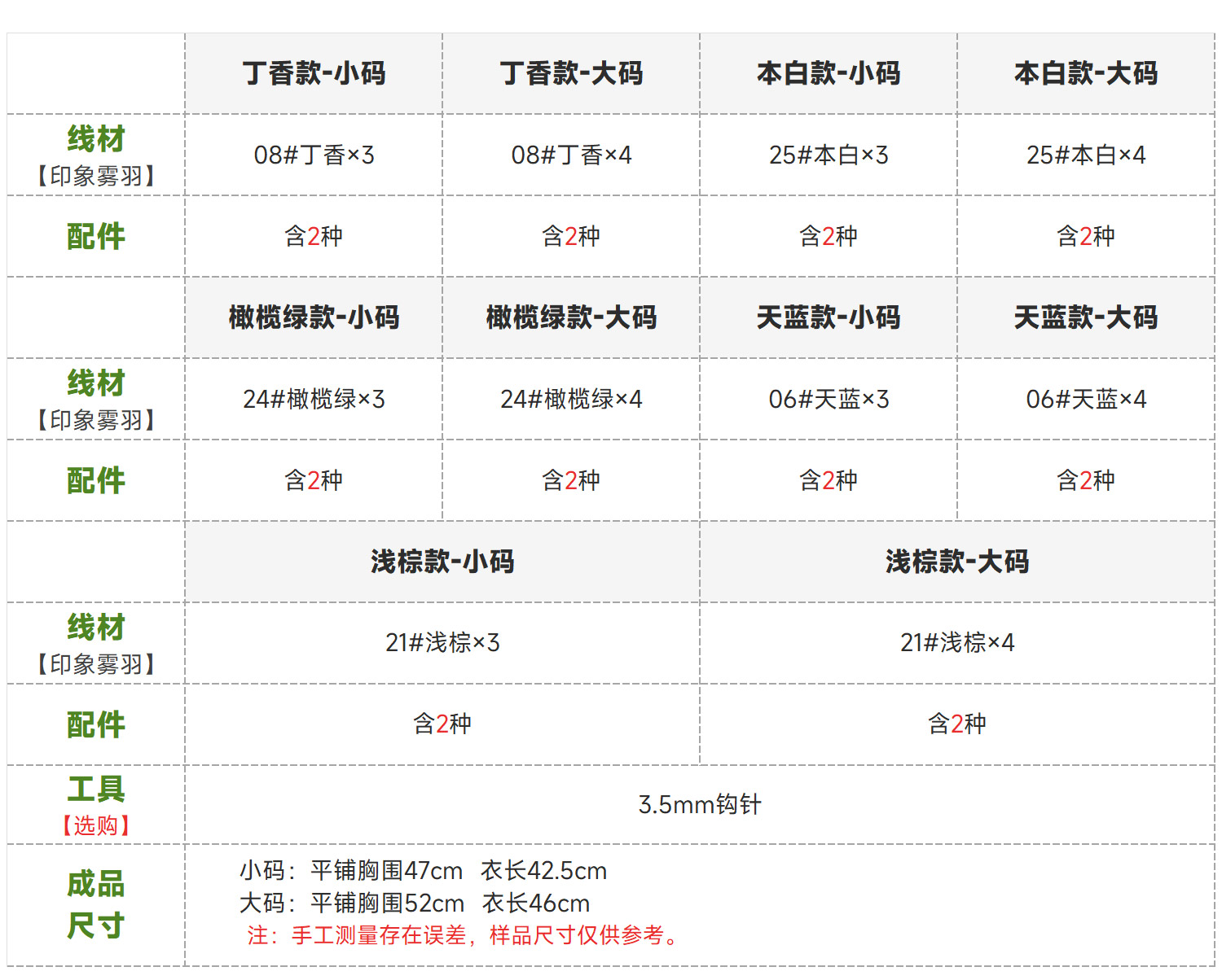 所有材料包均不含工具,織圖上標示的針號為中國制(例如9號=3.75mm)