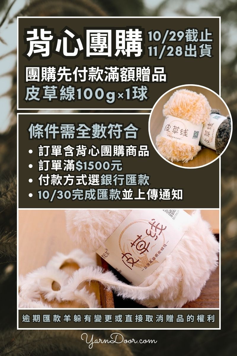 六、先付款訂單滿NT$1500元贈送【雪妃爾皮草線100g×1】再滿千元累積贈送